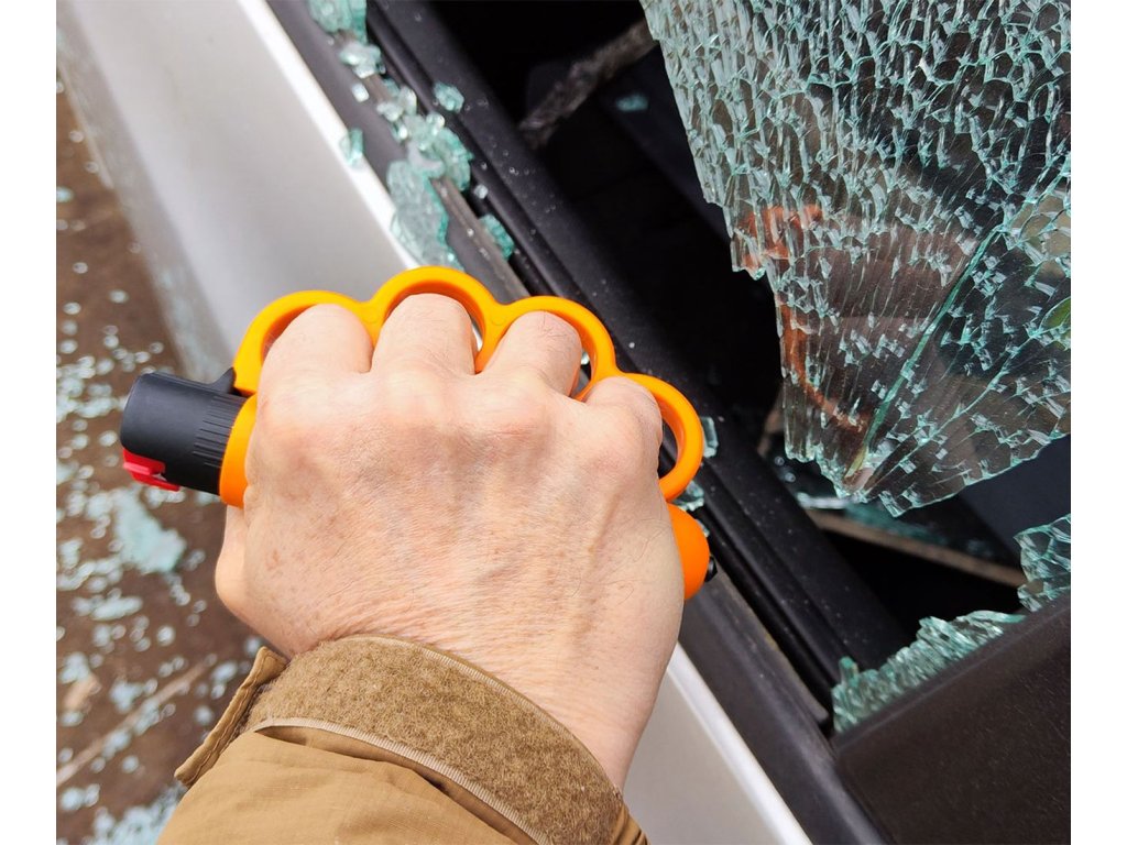 - ve spodní části rukojeti se nachází rozbíječ skel, který má hrot z karbidu wolframu. Je navržen tak, aby dokázal rozbít sklo – například okno auta – lehkým úderem, což je užitečné při autonehodě nebo v situacích, kdy je potřeba rychlý únik. Hrot není příliš ostrý, takže se o něj při běžném nošení nebo manipulaci neporaníte