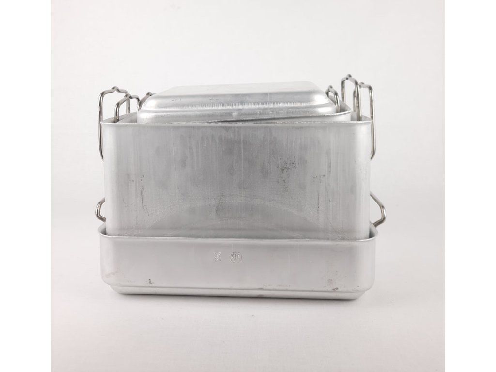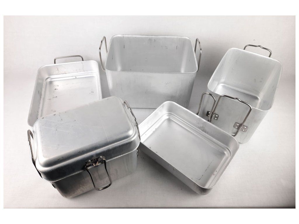 Přepravní taška s hranatými hrnci a pánvemi z hliníku