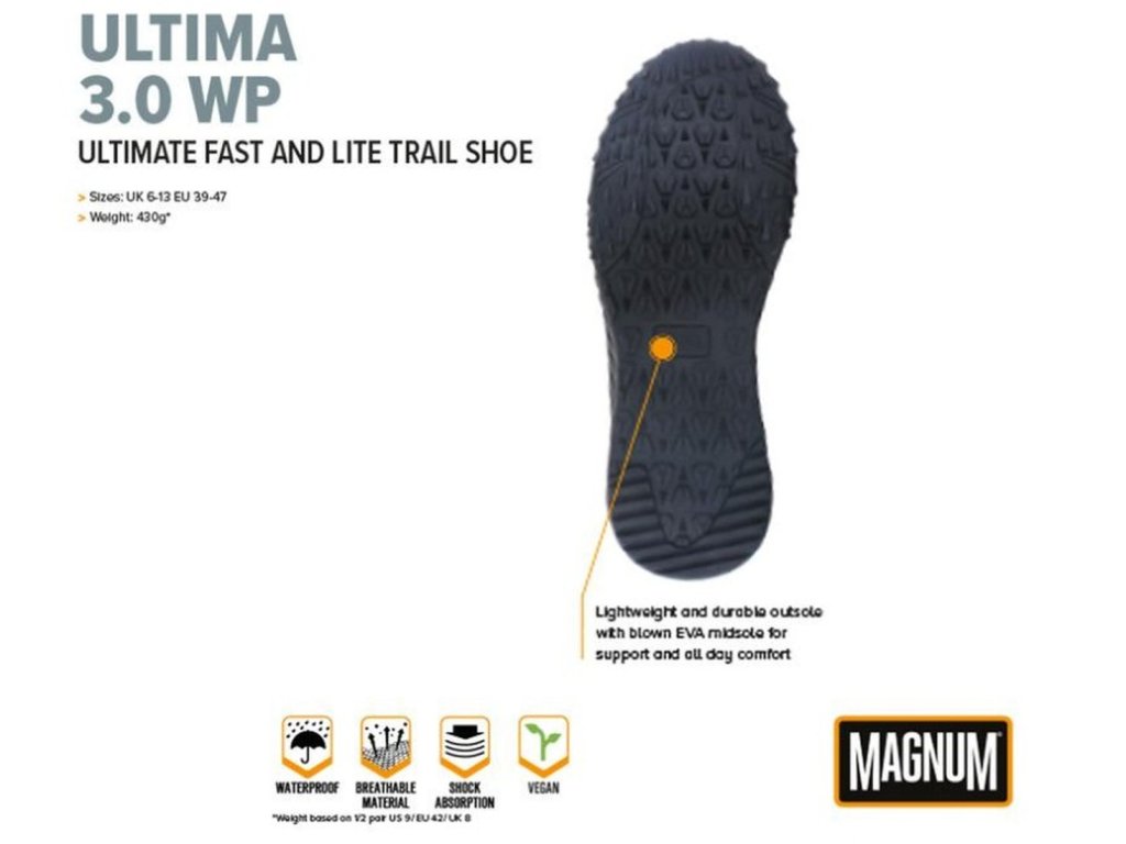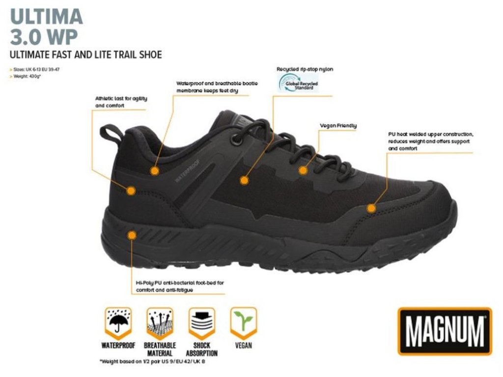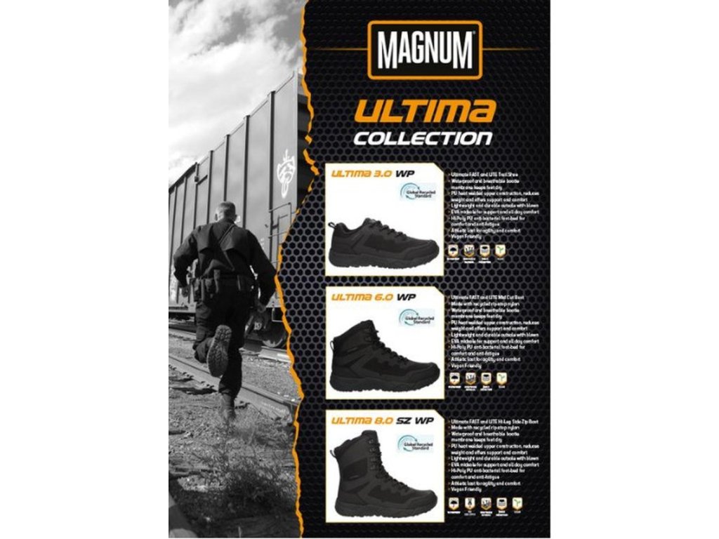 Ultima 3.0 od značky Magnum je nízká bota ze série Ultima Einsatzstiefel a byla vyrobena ze 100% recyklovaných plastových lahví. Celkové procento recyklovaného materiálu použitého k výrobě této boty je přes 76 %. To je velký krok společnosti Magnum k udržitelné výrobě. Toto ekologické myšlení nijak nesnižuje kvalitu ekologické výroby. Bota splňuje všechny požadavky na kvalitu a očekávání, která máme pro funkční botu od Magnum. Je lehká, robustní a vodotěsná.