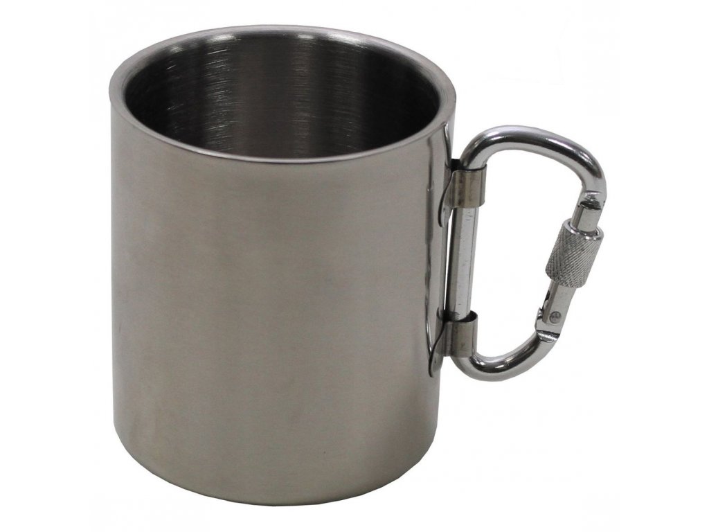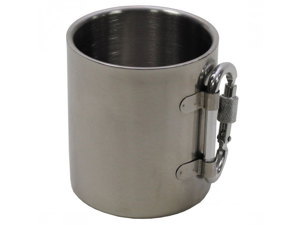 Dvouplášťový nerezový hrnek 300 ml s ouškem ve tvaru karabiny, kterou lze snadno hrnek připnout k batohu či jiné výbavě.