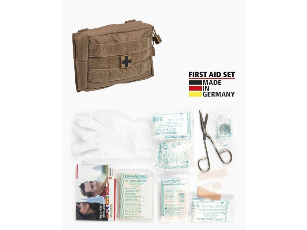 Vybavená osobní lékárnička kompaktních rozměrů s MOLLE vazbou a sadou první pomoci od německého výrobce Leina-Werke GmbH.