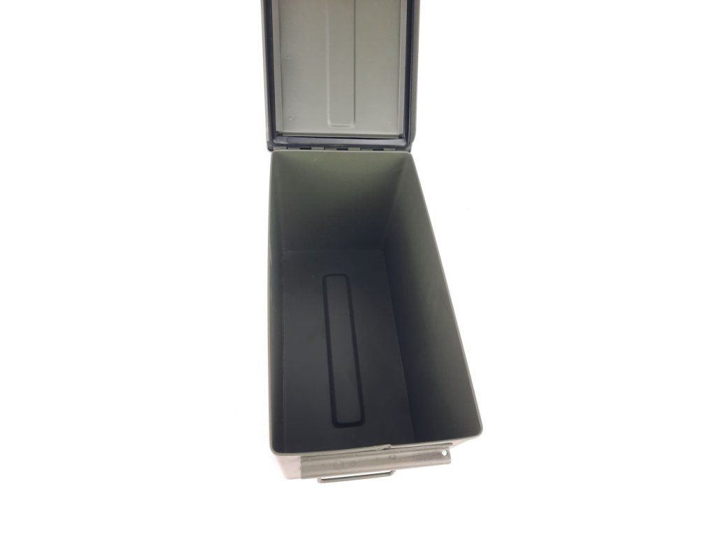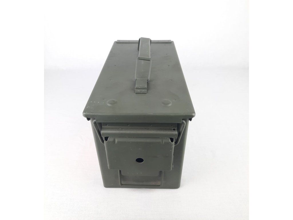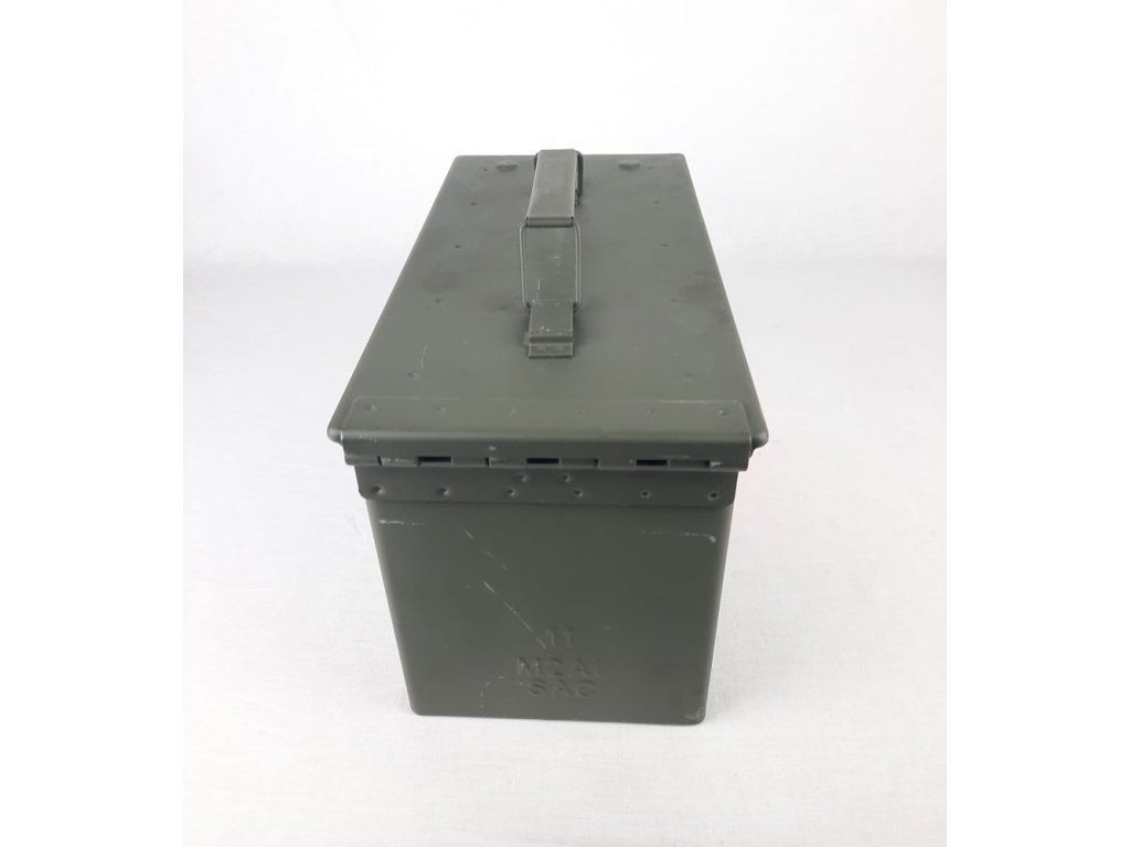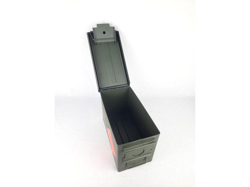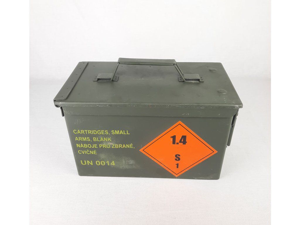 Kovová muniční bedýnka s horním madlem pro přenášení.