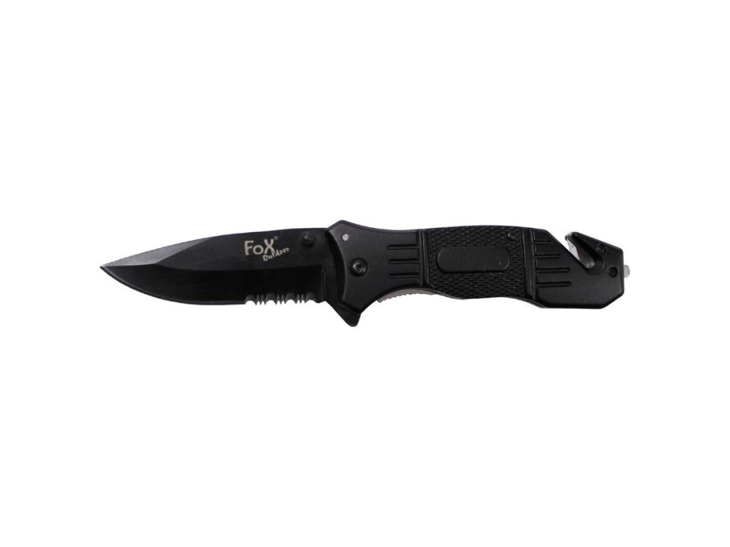 Zavírací nůž s částečně zoubkovaným ostřím, řezačem pásů a hrotem k rozbíjení skla.
