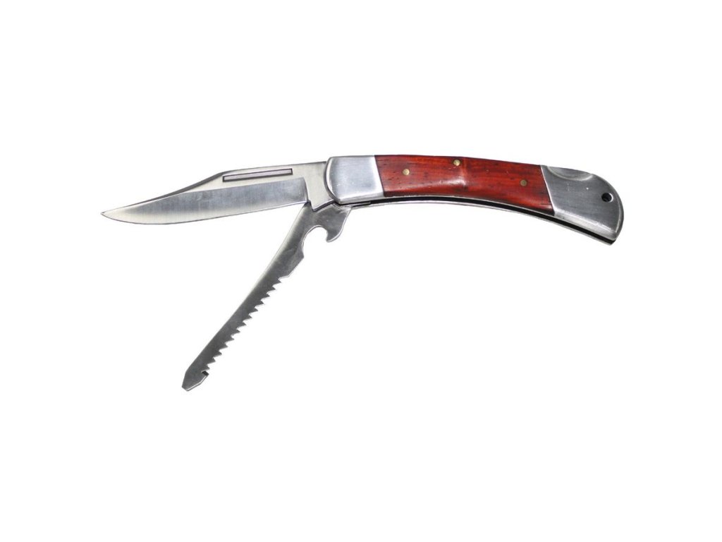 Lovecký kapesní zavírací nůž s hladkým ostřím, pilkou, otvírákem a dřevěnou rukojetí.