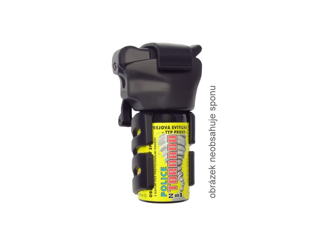- obsahuje pojistku, která zajišťuje hlavici spreje pevně v pouzdře a zároveň zabraňuje samovolnému odklopení víčka. U sprejové svítilny TORNADO tak pojistka zabraňuje nežádoucímu rozsvícení anebo naopak umožňuje zafixovat víčko spreje v rozsvícené poloze a použít tak sprej TORNADO jako improvizovanou svítilnuspeciální patentovaná (EP 1604587, US Pat.: 7,380,692, RU Pat.: 2352233)