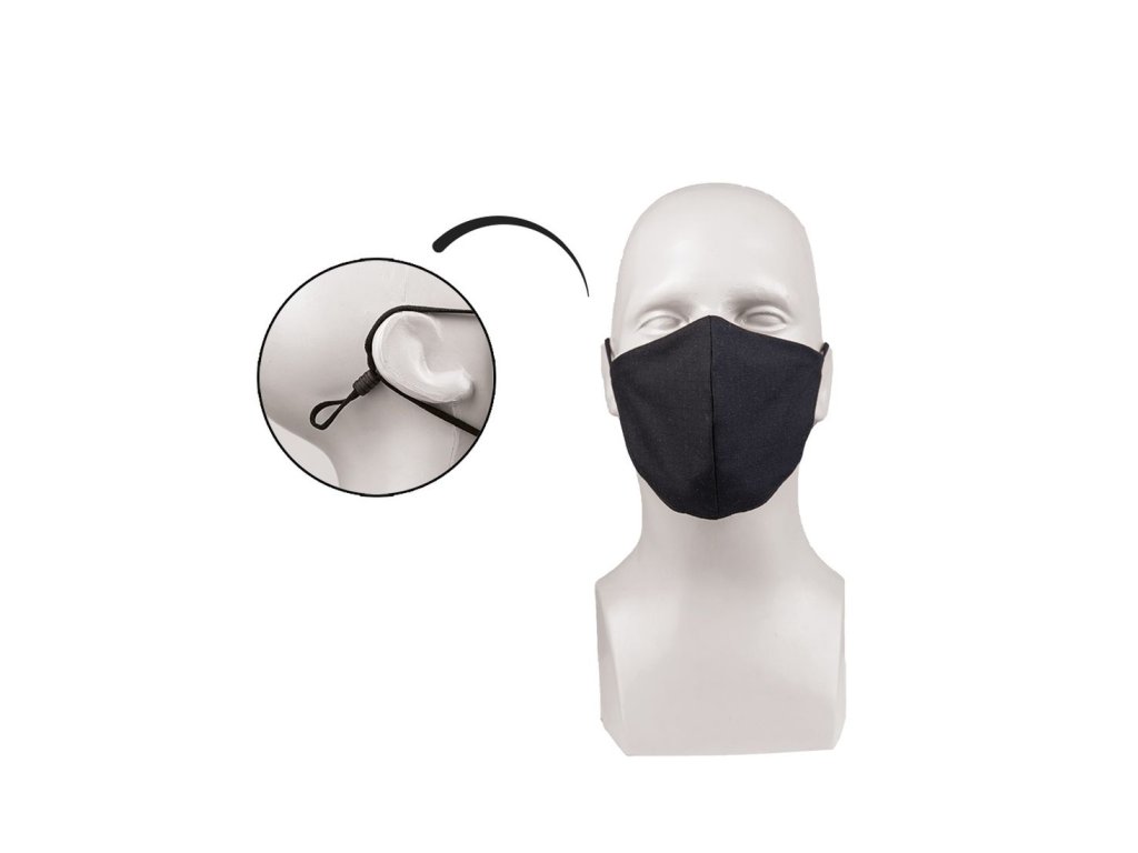 Dvouvrstvá rouška na ústa se stavitelným nastavením za uši pomoci šňůrky s rychlosponou.