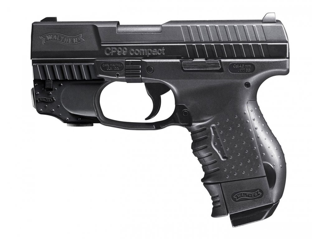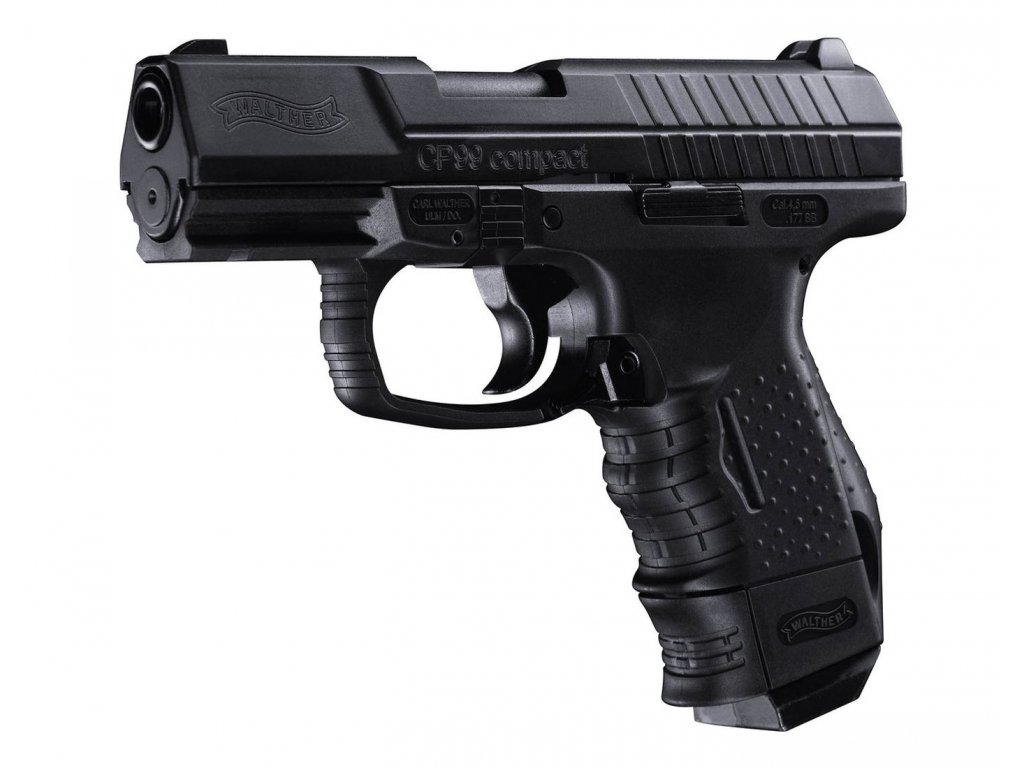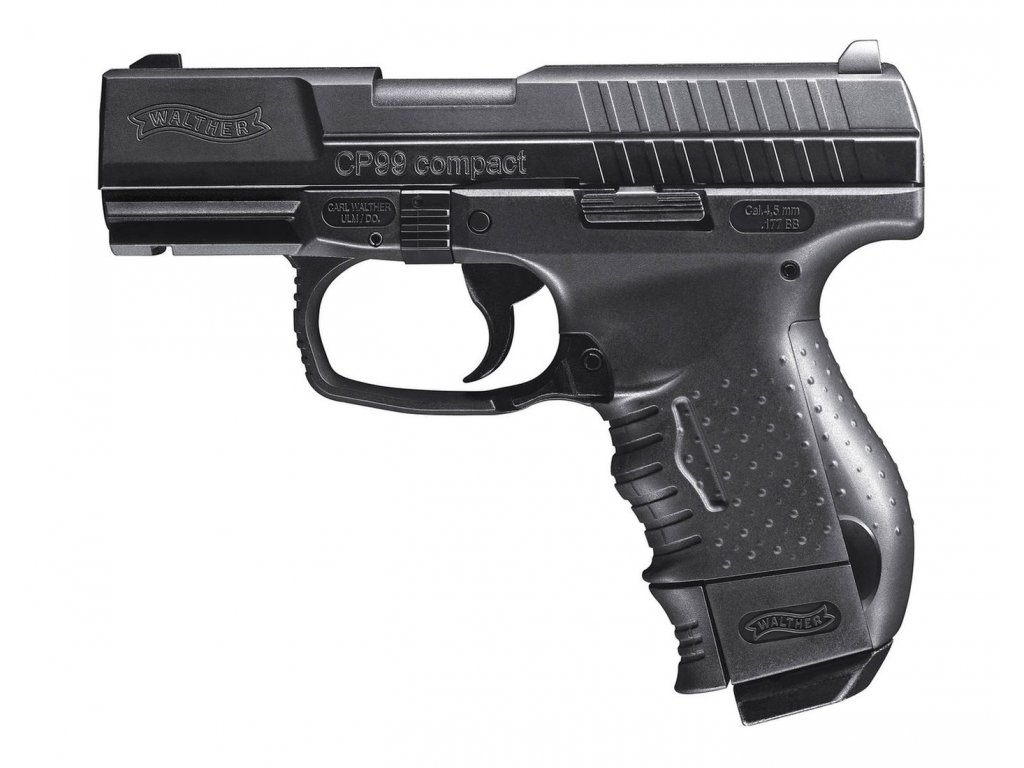 Přesná replika bojového Walther P99 Compact na 4,5 BB broky se systémem Blow Back. Ostrá verze této zbraně je používána taktickými jednotkami v USA. Vynikající tvarování pažbičky a dobré vyvážení zbraně umožnují pohodlné držení a přesnou střelbu.
